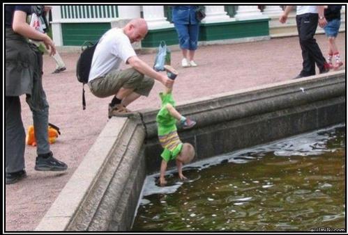 They dropped something into the fountain and the kid wanted to get it. So the dad obliged. Or maybe they are gathering the shiny coins.