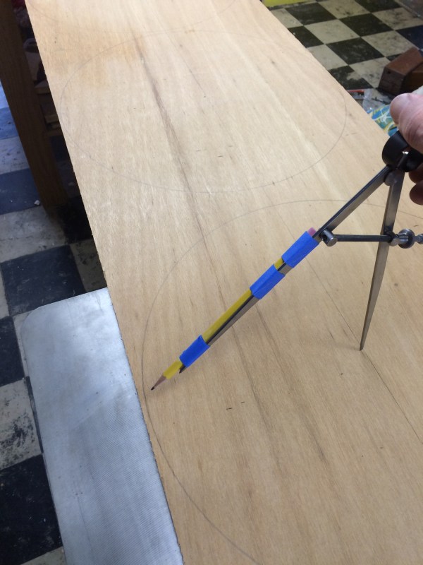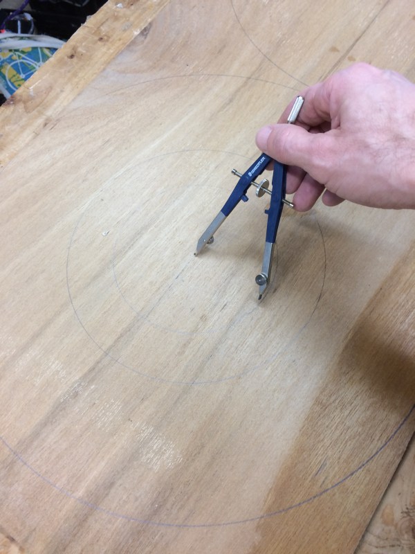 I was basically done with the frame and used scrapers and planes to clean up glue squeeze out and make sure the frame surfaces were level, plumb, and/or square as needed. Then it was time to make the wheels. I had tons of scrap quarter inch luan plywood that was 25 years old or more. I had pulled it off the poorly finished basement ceiling when we bought the house and just stacked it in the corner. I used several sheets to build a kayak 15 years ago, and now I’m making a band saw with some more of it. I took a pair of dividers and taped a pencil to one leg to make a large compass. I drew a bunch of slightly large circles on a scrap of plywood. Attachment 55814 Then I used a nice compass to draw a smaller circle that will be the same diameter as a flange for lining stuff up later. And I drew a medium sized circle to locate the 4 clamp holes later. Attachment 55815 I cut these circles out square and glued them up, alternating the grain direction of the outside surface of plywood. I used lots of glue again. I want these to be glued well, and I’ve got a gallon of glue. Attachment 55816 Maybe I used too much glue. :) Better too much than too little here. What a mess! Attachment 55817 |