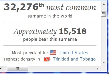 1,877th most common surname in the world Most prevelant in:United States Highest density in:Saint Kitts and Nevis (say that's kinda cool) |