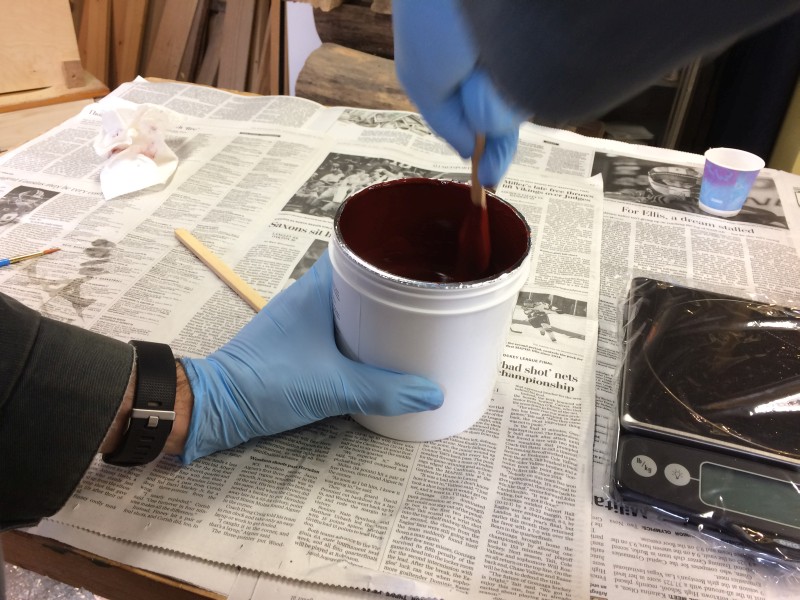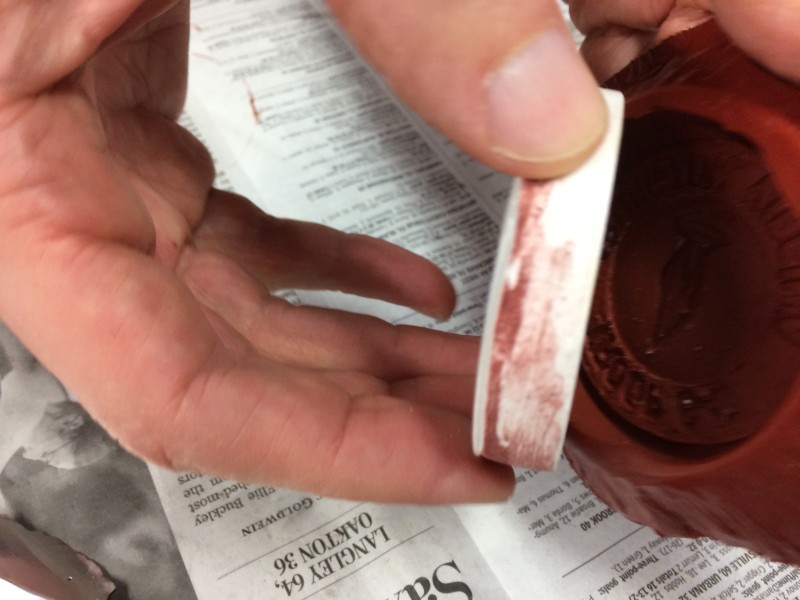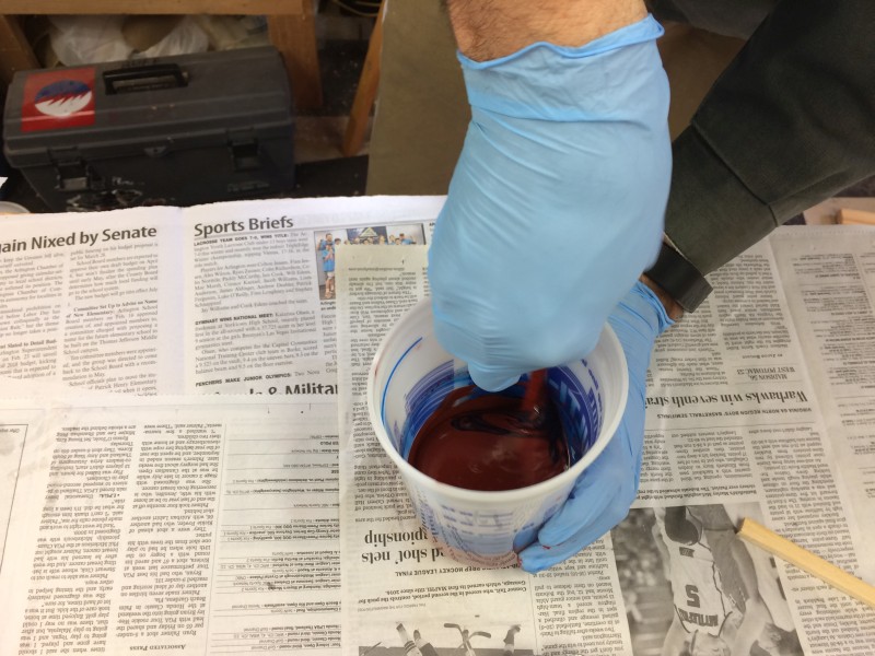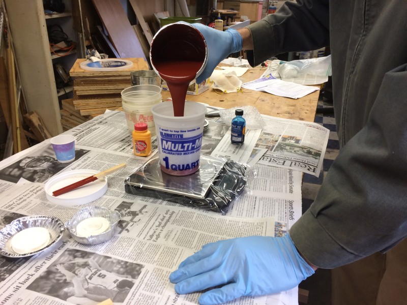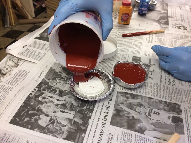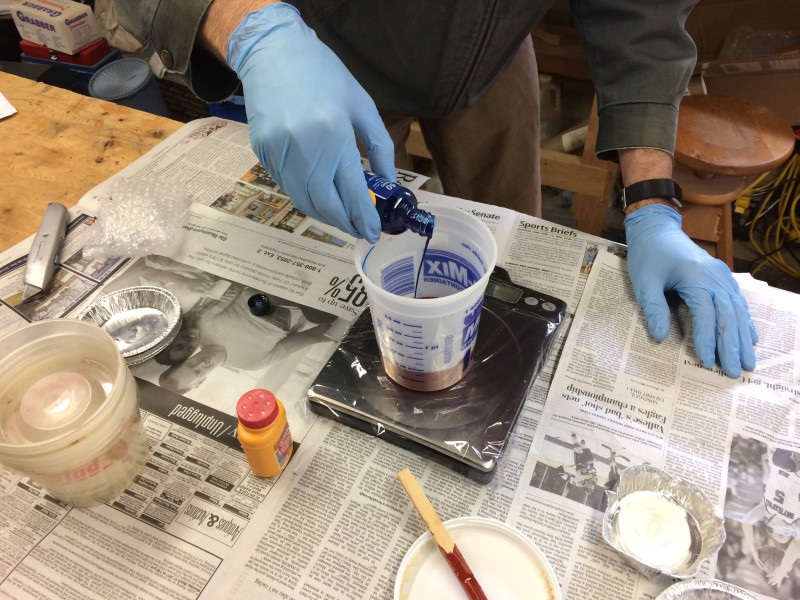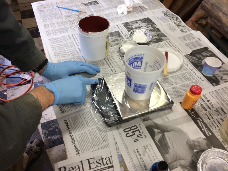 After sleeping late this morning and getting some breakfast, we headed down into the shop to start the next step. The silicone rubber takes 24 hours to cure, so we had to do it Saturday morning to be able to pour pewter on Sunday.