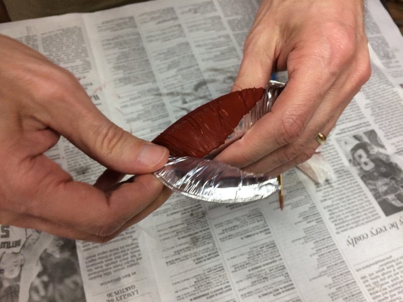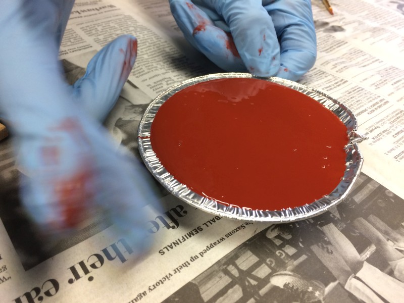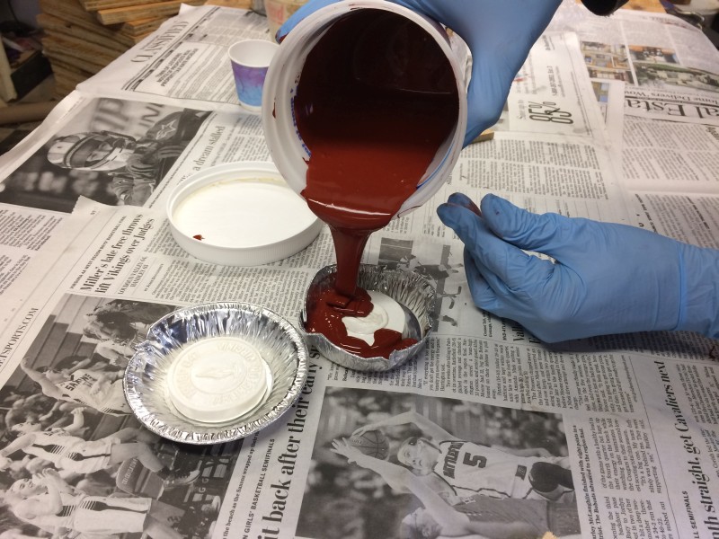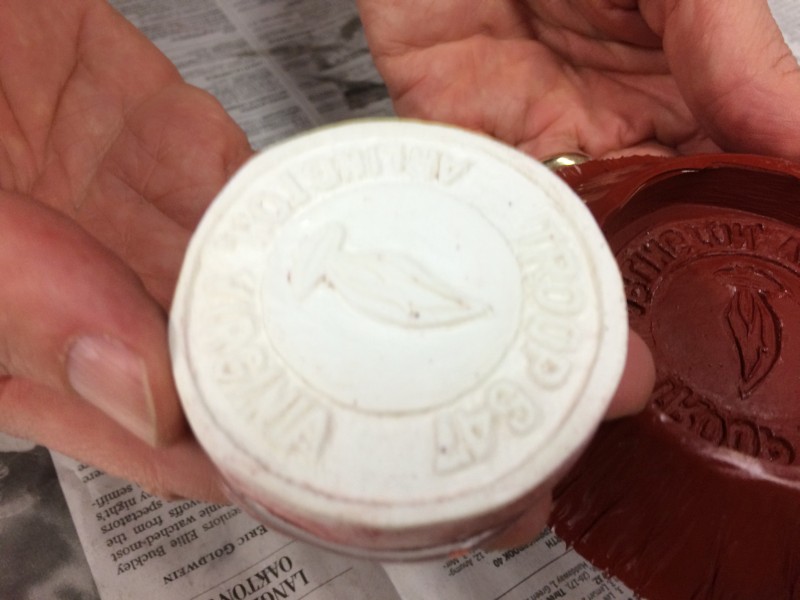 All that mixing had introduced bubbles, so we had to tap the molds for a few minutes to encourage the bubbles to rise away from our precious plaster emblems and pop at the surface.