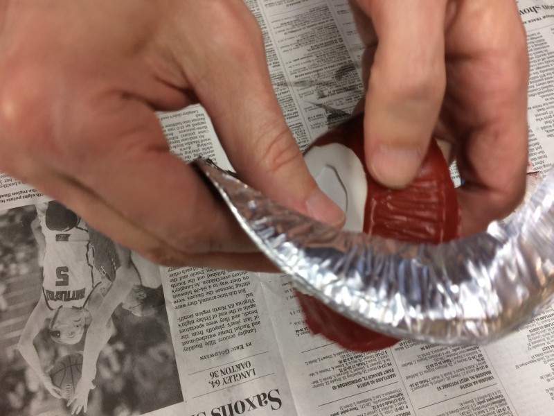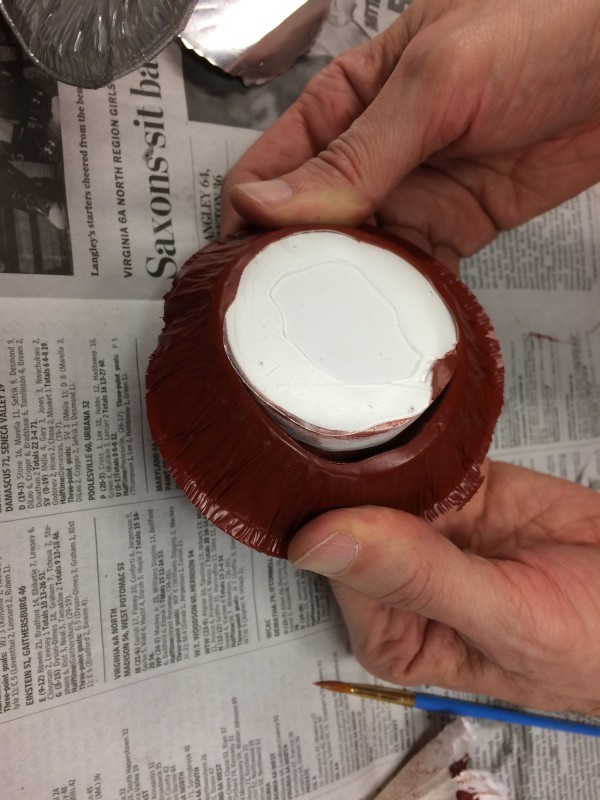 Attachment 59520 These were supposed to set up for 24 hours before we use them, but my son was impatient and he attacked his after three hours. It was set up nicely. So I started peeling the foil side of the pie plate away from my new rubber mold. Attachment 59521 I kept peeling and even peeled the foil away from the hot glue that held it to the plaster. Attachment 59522 And then I pulled back on the rubber edge a little, and it separated pretty easily from the plaster. Attachment 59523 |