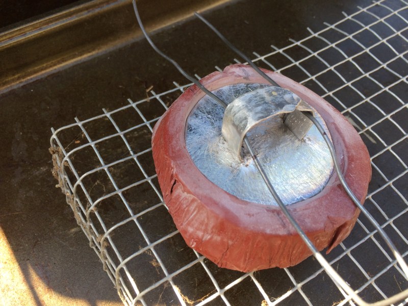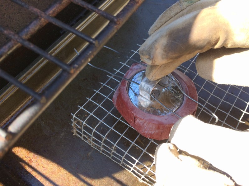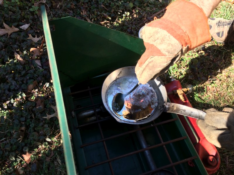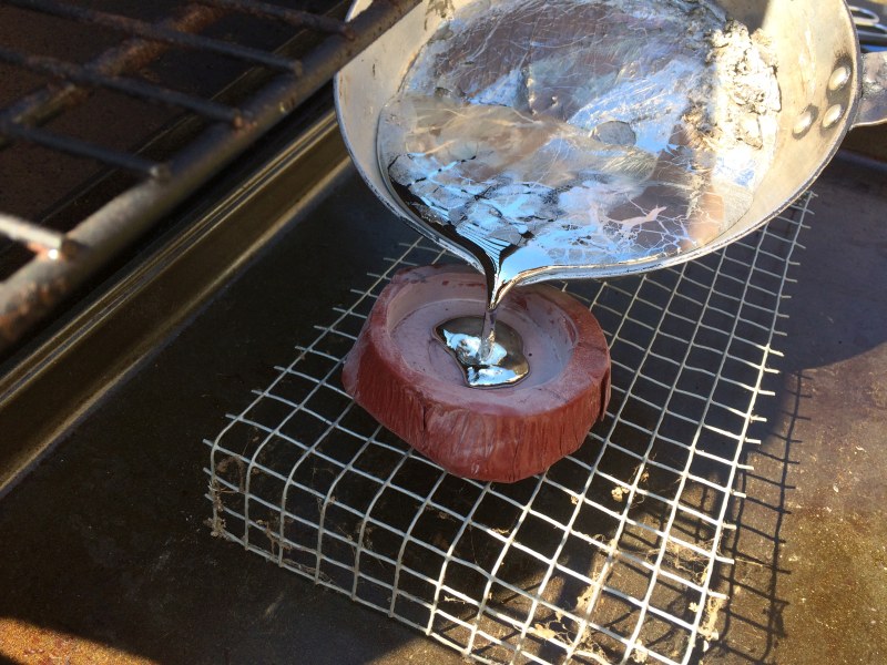 Attachment 59558 And the molds in the gas grill are up to about 200 degrees F. Attachment 59559 We scrape the scum on the surface to the side. Attachment 59560 And here, I'm pouring into my mold. It was too busy for an action shot. The loops wanted to float up on the surface, and also I realized the grill is not level. Attachment 59561 |
