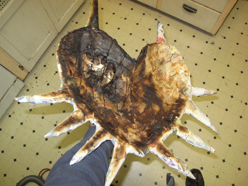 I think the lighter spots were colder / wetter. No matter, paint covers a multitude of sins. Attachment 35281 Now the spikes around the perimeter have been made and attached and papered on. Something to note here, there are some tinier strips placed on the surface, not near the spikes on the edge. These are little patches that cover rougher spots. I now know that the big strips, while wet, still have some stiffness when twisted over the compound curves of this complex shape. I learned mid-mask that one way to deal with this is to use little patches like this instead of big long strips. One really brilliant idea was to use many small triangles over a surface like this! That's really smart. Of course, you need enough base surface to hold the triangles but they can be tiled with practically no bending and buckling. Noted for future reference! Attachment 35282 Here's a nice little closeup of the spikes on the edge. I started out with a long narrow v of wire that I wound a wad of paper around in the rough size and shape of the spikes. Then I "finished" the shape with masking tape. Then I used the long protruding ends of the v to punch through and wind around the triple wire that comprised the rim of the mask. I say "I" and that's true. For the first one. SonofV did the other nine. Once they were all wired in place, they got papered on. Attachment 35283 Ok. This was actual fire. I'm guilty of being impatient and under the gun timewise. I wanted to try to cycle two layers in one day. Remember the oversize problem with the bulgy eyes? Yeah.... the spikes... they exacerbated this problem raising the damn mask even higher since I had to put it in at an angle. And.. I might have had a problem with the oven because I had cooked in it this same day. It was already hot, too hot, obviously. I'd set it (back down) to about 250 degrees, but it was still blazing from the cookies I'd made earlier. Just stupid. Lucky, but stupid. Fortunately all the fire was on the inside, and didn't pierce the outer surface except in one tiny place. Where the left eyehole would be. Definitely lucky. Attachment 35284 |