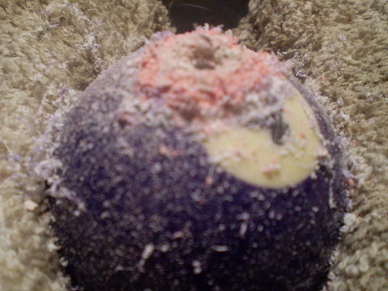 I got a bigger drill and began to enlarge the hole in the ball. This is the same picture from the What is this? thread. I thought it was kind of a neat picture. Notice how the step is square, despite having a pointed drill. Interesting, to me at least. This shot, blurry as it is, also shows how deep the colors are.