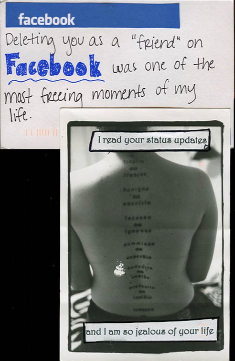 Alternatively, why not just have some fun with her? Tell her what a sanctimonious bitch she is, or make snarky comments, or just flat-out lie to her about how your life turned out. It could be very therapeutic. I have one like that too. Source of some deep pain when I was 14 or so - long complicated story that changed my life dramatically for years thereafter. I got a request from a mutual friend, and she (kind of a pollyanna) kinda shmushed us back together - this girl requested me and I accepted to please the pollyanna. As a result I am constantly reminded of how much we have in common and why we were BFF's in the first place . . . but OTOH, of why I couldn't stand her. It's like eighth grade all over again. I need to take my own advice! In her case it's not financial bragging but intellectual "I'm smarter than you and always knew it" bragging. Which is how it began all those years ago, too. Weirder still, our lives turned out very similar - it's not like she got a Ph.D and left me behind uneducated in the dust. There are many, many kinds of envy. |