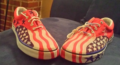 Our party is tonight. Attachment 49381 The shoes I made are pretty Swagg, too. Attachment 49383 I bought red sneaks, and hit them with fabric markers. I finished the stars around the sole after the picture..... and striped the laces a little... |