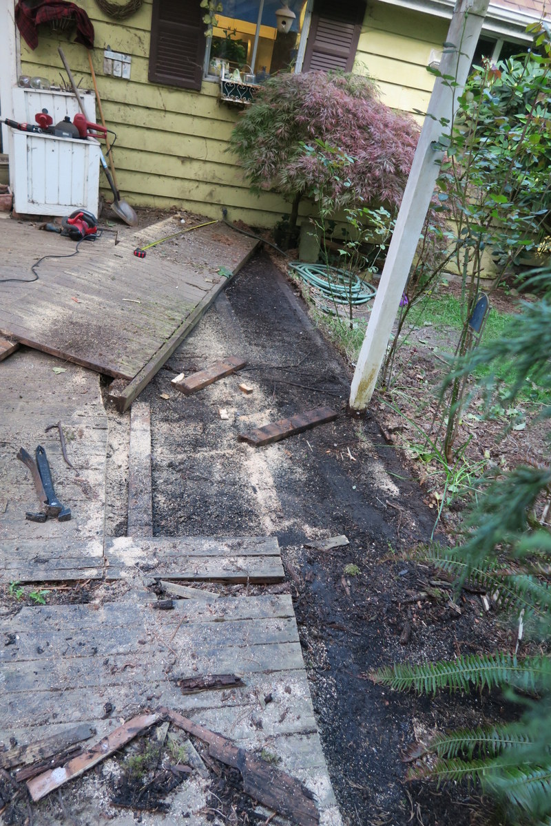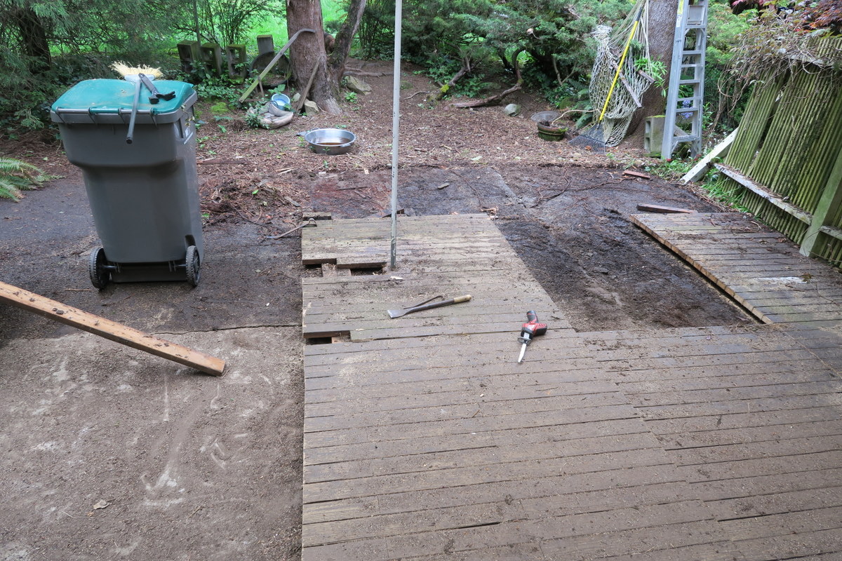 There had been a deck installed many years ago, set directly on the concrete patio. The patio was (and is) covered by a roof for the first two-thirds closest to the house. The furthest third of the deck was open to the sky (and the trees). No walls, only the house on one side of the rectangle. We had a lot of good times on the deck, it's a very well used and well loved extension of our living space. We'd eat and entertain out here, work on not-indoor-projects out here; it is lovely and useful. Well, the deck itself wasn't very lovely. The orginal deck was in very shabby shape. You can see here the extent of the coverage the deck has under the flat corrugated plastic covering. Attachment 64829 You can also see how much more weather-beaten the exposed section was. There were pieces that had rotted away and laurel volunteers growing up through the vacancies. Much of this area was unsafe to walk on and all of it was unsightly and unused. It was time for it to go. Attachment 64830 |