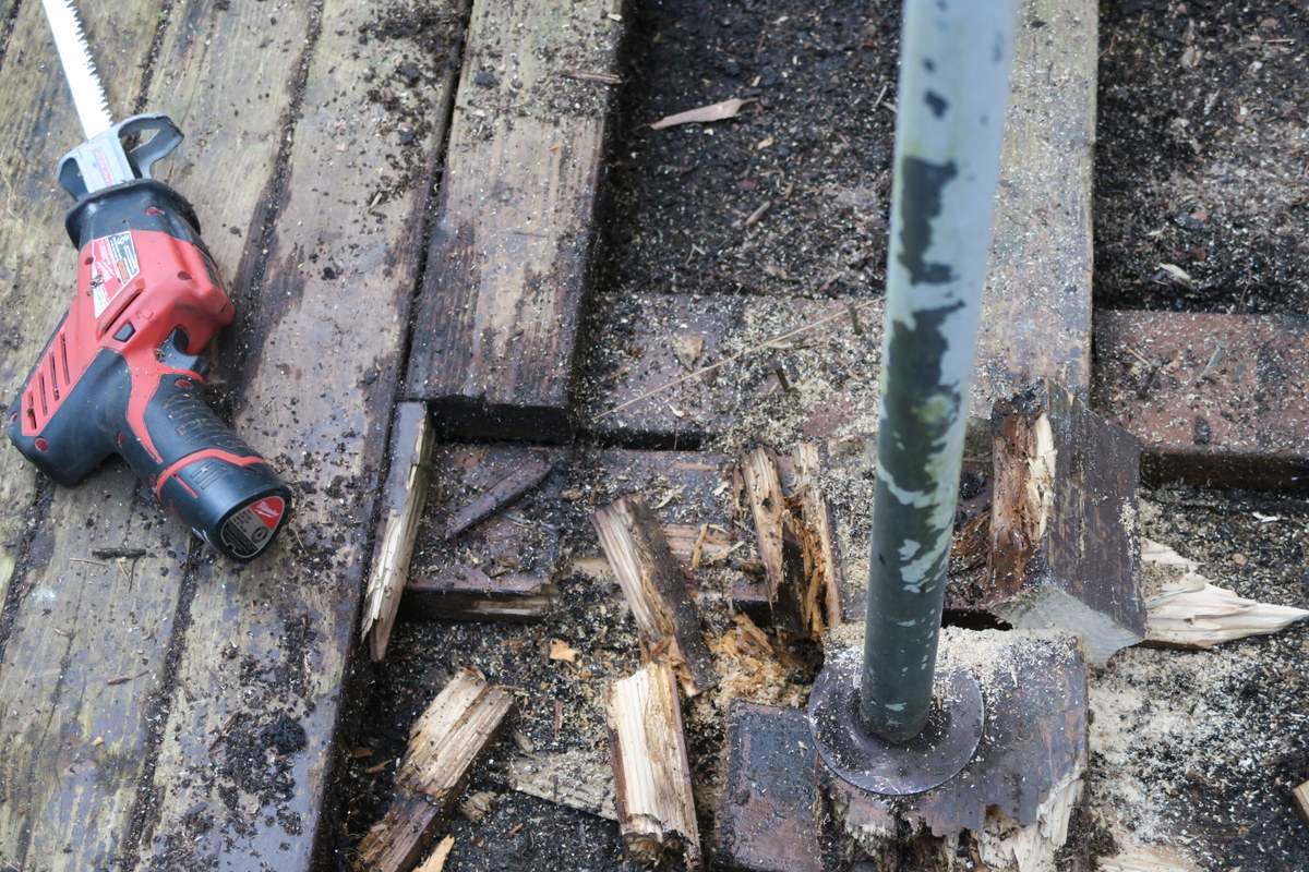 Since I had no intention of preserving it, I decided to cut it up into manhandleable-sized pieces and manhandle them into the truck and out to the dump. Let the sawdust begin!