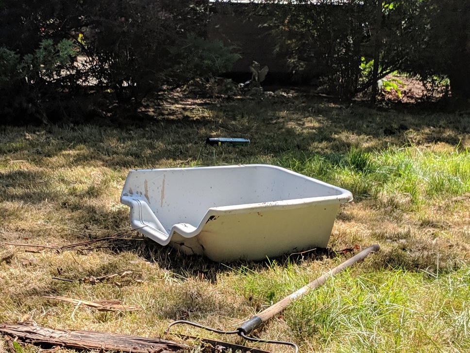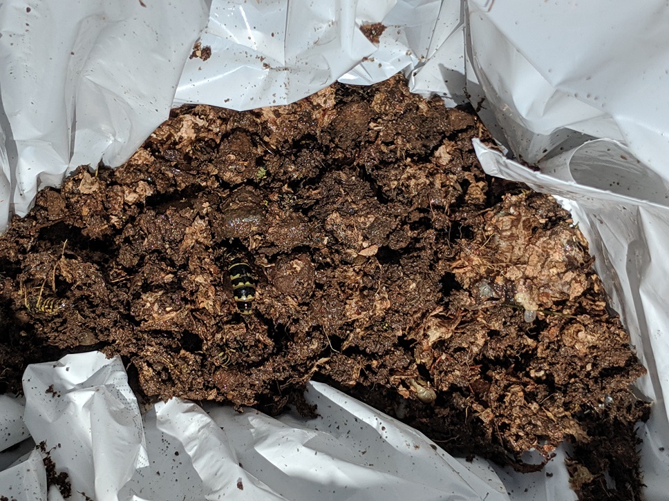 I cleared the area very neatly as I wanted make sure I had a clear understanding of the scope of the problem. In this wider shot you can see I've uncovered the top of the nest. The whole thing was about the size of a large cantaloupe. Attachment 68328 When I went to try to pry it out intact, I wound up tipping the axis of the core with the four horizontal disks of hive inside the paper skin. This was unintentional, but very revealing. There are (barely still) living yellowjackets in this shot, having spent a second can of chemical warfare, but they're subdued. Attachment 68329 So I took the opportunity to kick'em while they were down. What? I'm not paying me to bring these bombs back home! This final strike made a very wet soggy mess of the whole/hole affair. Attachment 68330 Plus, as you can see here in the distance, I'd staged more cans of poison along my escape route should I need to beat a hasty retreat. Hopefully I wouldn't trip on the rake on my way out. |