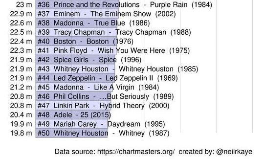 RIAA Best Selling Artists 1. THE BEATLES Albums sold: 183 million 2. GARTH BROOKS Albums sold: 148 million 3. ELVIS PRESLEY Albums sold: 146.5 million 4. EAGLES Albums sold: 120 million 5. LED ZEPPELIN Albums sold: 111.5 million 6. BILLY JOEL Albums sold: 84.5 million 7. MICHAEL JACKSON Albums sold: 84 million 8. ELTON JOHN Albums sold: 78.5 million 9. PINK FLOYD Albums sold: 75 million 10. AC/DC Albums sold: 72 million 11. GEORGE STRAIT Albums sold: 69 million 12. BARBRA STREISAND Albums sold: 68.5 million 13. THE ROLLING STONES Albums sold: 66.5 million 14. AEROSMITH Albums sold: 66.5 million 15. BRUCE SPRINGSTEEN Albums sold: 66.5 million 16. MADONNA Albums sold: 64.5 million 17. MARIAH CAREY Albums sold: 64 million 18. METALLICA Albums sold: 63 million 19. WHITNEY HOUSTON Albums sold: 58.5 million 20. VAN HALEN Albums sold: 56.5 million 21. FLEETWOOD MAC Albums sold: 54.5 million 22. U2 Albums sold: 52 million 23. CÉLINE DION Albums sold: 50 million 24. NEIL DIAMOND Albums sold: 49.5 million 25. JOURNEY Albums sold: 48 million 26. KENNY G Albums sold: 48 million 27. SHANIA TWAIN Albums sold: 48 million 28. KENNY ROGERS Albums sold: 47.5 million 29. ALABAMA Albums sold: 46.5 million 30. EMINEM Albums sold: 46 million 31. BOB SEGER & THE SILVER BULLET BAND Albums sold: 44.5 million 32. GUNS N’ ROSES Albums sold: 44.5 million 33. ALAN JACKSON Albums sold: 43.5 million 34. SANTANA Albums sold: 43.5 million 35. TAYLOR SWIFT Albums sold: 43 million 36. REBA MCENTIRE Albums sold: 41 million 37. ERIC CLAPTON Albums sold: 40 million 38. CHICAGO Albums sold: 38.5 million 39. SIMON & GARFUNKEL Albums sold: 38.5 million 40. FOREIGNER Albums sold: 38 million 41. ROD STEWART Albums sold: 38 million 42. TIM MCGRAW Albums sold: 37.5 million 43. BACKSTREET BOYS Albums sold: 37 million 44. 2 PAC Albums sold: 36.5 million 45. BOB DYLAN Albums sold: 36 million 46. DEF LEPPARD Albums sold: 35.5 million 47. QUEEN Albums sold: 35 million 48. DAVE MATTHEWS BAND Albums sold: 34.5 million 49. BRITNEY SPEARS Albums sold: 34.5 million 50. BON JOVI Albums sold: 34.5 million |