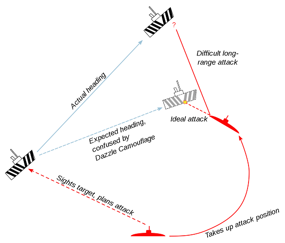 Depiction of how Norman Wilkinson intended dazzle camouflage to cause the enemy to take up poor firing positions. Link |