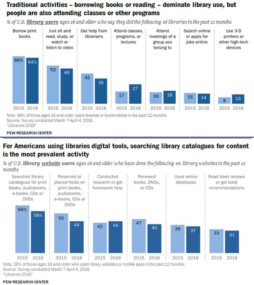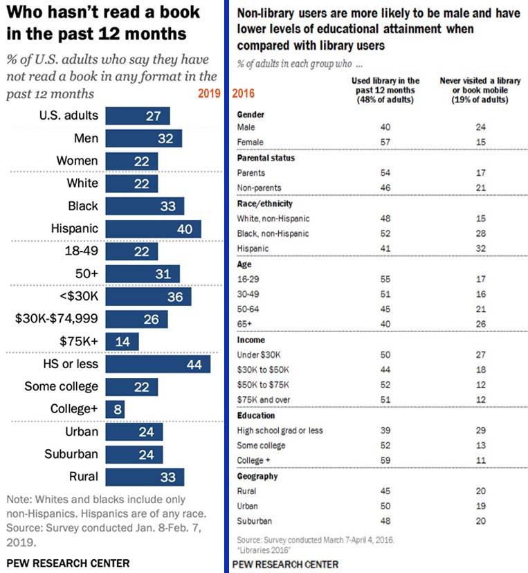 2019 chart from the PEW. Then digging a little deeper a whole 2016 report on the public's relationship with libraries, and the services they provide beyond just books. Attachment 69843 Who uses the library and for what? Attachment 69844 General appreciation or ambivalence by whom. Attachment 69845 The best way to cure ignorance is shoot it.. PEW PEW PEW Sorry, that was bad. :blush: Attachment 69846 I'm guilty, I read a lot, I think more than most of my peers. But I haven't read a non-technical book for years... and years. |