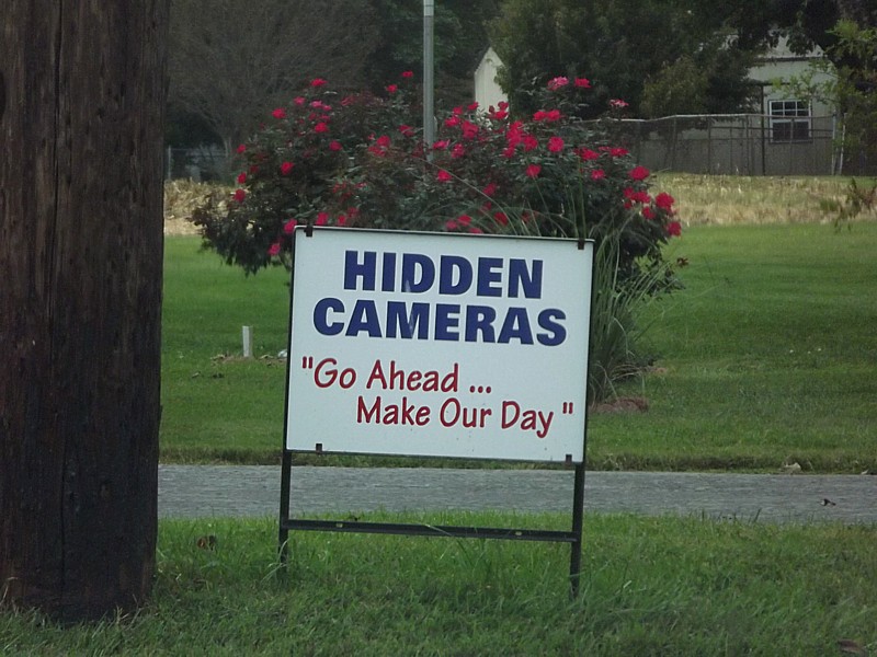 Ok, If you had hidden cameras, why advertise it? And why taunt thieves/vandals? They had three of these signs in their yard, btw...