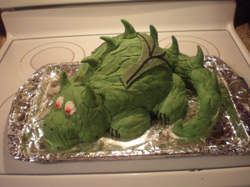 2 pound cakes, rice krispy treat, and covered it with fondant. It took her about 7 hours. She cut out each scale individually. And it tasted yummy!