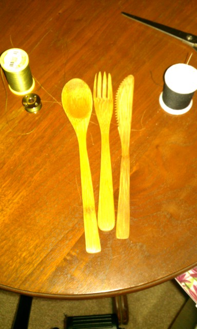 So one of my hippie friends decided that she wanted to have some tableware to carry around with her in the event that she would buy some fast food and not want to use plasticware. She bought a set of bamboo tableware when we were at an upscale culinary store in the mall. She's real into that whole sustainability thing. She drives a Prius and recently got solar panels installed on her otherwise conventional surburban roof.