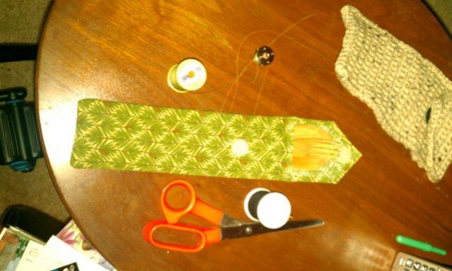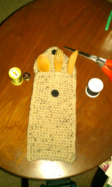 She mentioned in passing that it would be really nice to have a case of some kind to carry it in. There was nothing available in the store. As we were enjoying some TCBY cones I said, "Well, it shouldn't be too hard to do something." So I did something. I had in mind to sew something, but the sewing machine has been hibernating in a closet for several years, and I'm only a moderate sewer, anyway. I've been on a crochet kick recently, so I had some yarn and hooks within easy reach of my chair. So, the other night while I was watching Bones, I made a case. I put Velcro spots on it as a closure.
