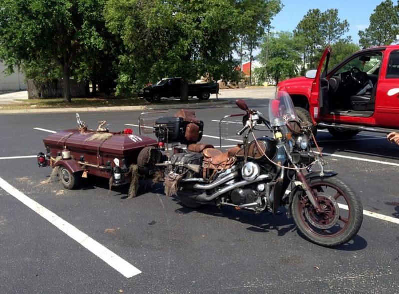 This iron horse has an actual saddle for a saddle. And reins. And a jug of XX busthead on the casket fender.