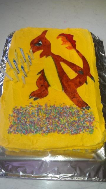 charmeleon is just rolled out plastic icing (that stuff wedding cakes are usually iced with) which I then cut the shape out of and then coloured in with a brush and food colouring. After I iced the cake with some butter frosting, I then simply plopped my artwork onto the cake. The rainbow stuff is just coloured sprinkles. I figured these types of creatures always seem to be standing on weird stuff, so I figured rainbow grass would be ok.